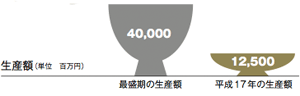 山中漆器の生産額は、平成元年頃をピークに半分以下まで落ち 込んでいるのが現状。その主な理由としては、ライフスタイル の変化の他、贈答市場の縮小、安価な海外製品の流入などがあ げられる。