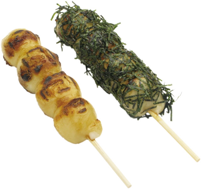 [ TEIBAN 5 HON SET ] 地元産コシヒカリ100%を使ったみたらし、醤油(しょうゆ)、よもぎ粒あん、磯辺、きなこの定番5本セットです。 注文を受けてから焼き始めるため、熱々の団子を味わうことができます。 テイクアウトもできます。